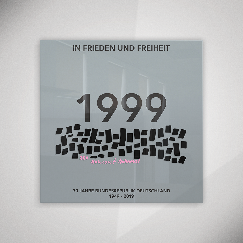 Die Hintergrund-Kaschierung trägt den jeweiligen Jahrgang, den Schriftzug "In Frieden und Freiheit" und die Jubiläumsangaben "70 Jahre Bundesrepublik Deutschland / 1949 - 2019". Auf der glänzenden Acrylplatte ist die Schrift des Künstlers mit Spezial-Lack gedruckt. Beim Jahrgang 1989 verzichtete der Künstler jedoch auf eine vorderseitige Beschriftung.