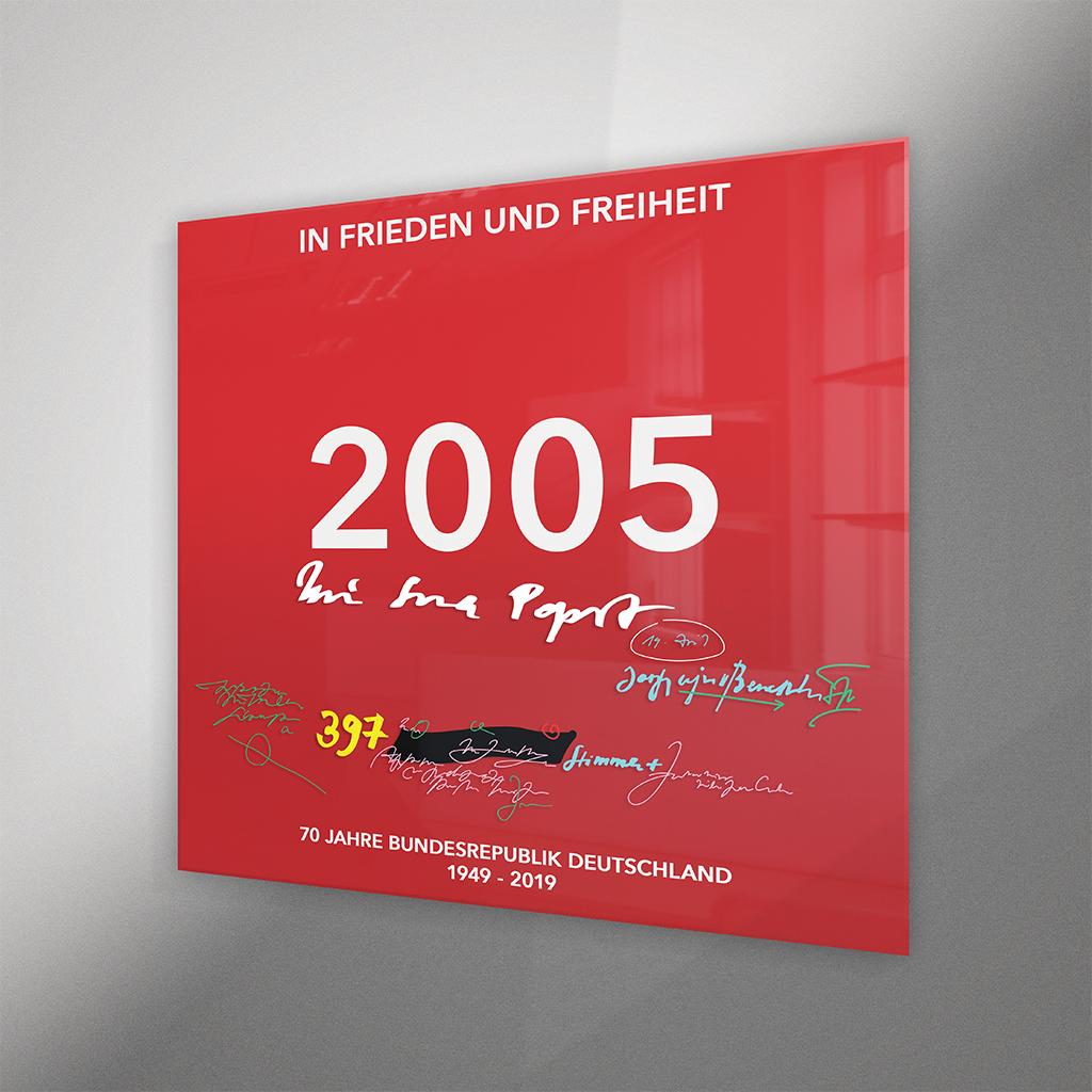 Die Hintergrund-Kaschierung trägt den jeweiligen Jahrgang, den Schriftzug "In Frieden und Freiheit" und die Jubiläumsangaben "70 Jahre Bundesrepublik Deutschland / 1949 - 2019". Auf der glänzenden Acrylplatte ist die Schrift des Künstlers mit Spezial-Lack gedruckt. Beim Jahrgang 1989 verzichtete der Künstler jedoch auf eine vorderseitige Beschriftung.