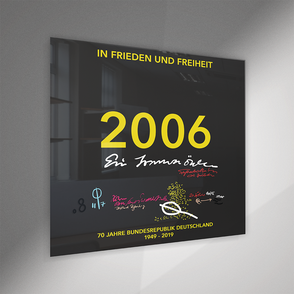 Die Hintergrund-Kaschierung trägt den jeweiligen Jahrgang, den Schriftzug "In Frieden und Freiheit" und die Jubiläumsangaben "70 Jahre Bundesrepublik Deutschland / 1949 - 2019". Auf der glänzenden Acrylplatte ist die Schrift des Künstlers mit Spezial-Lack gedruckt. Beim Jahrgang 1989 verzichtete der Künstler jedoch auf eine vorderseitige Beschriftung.