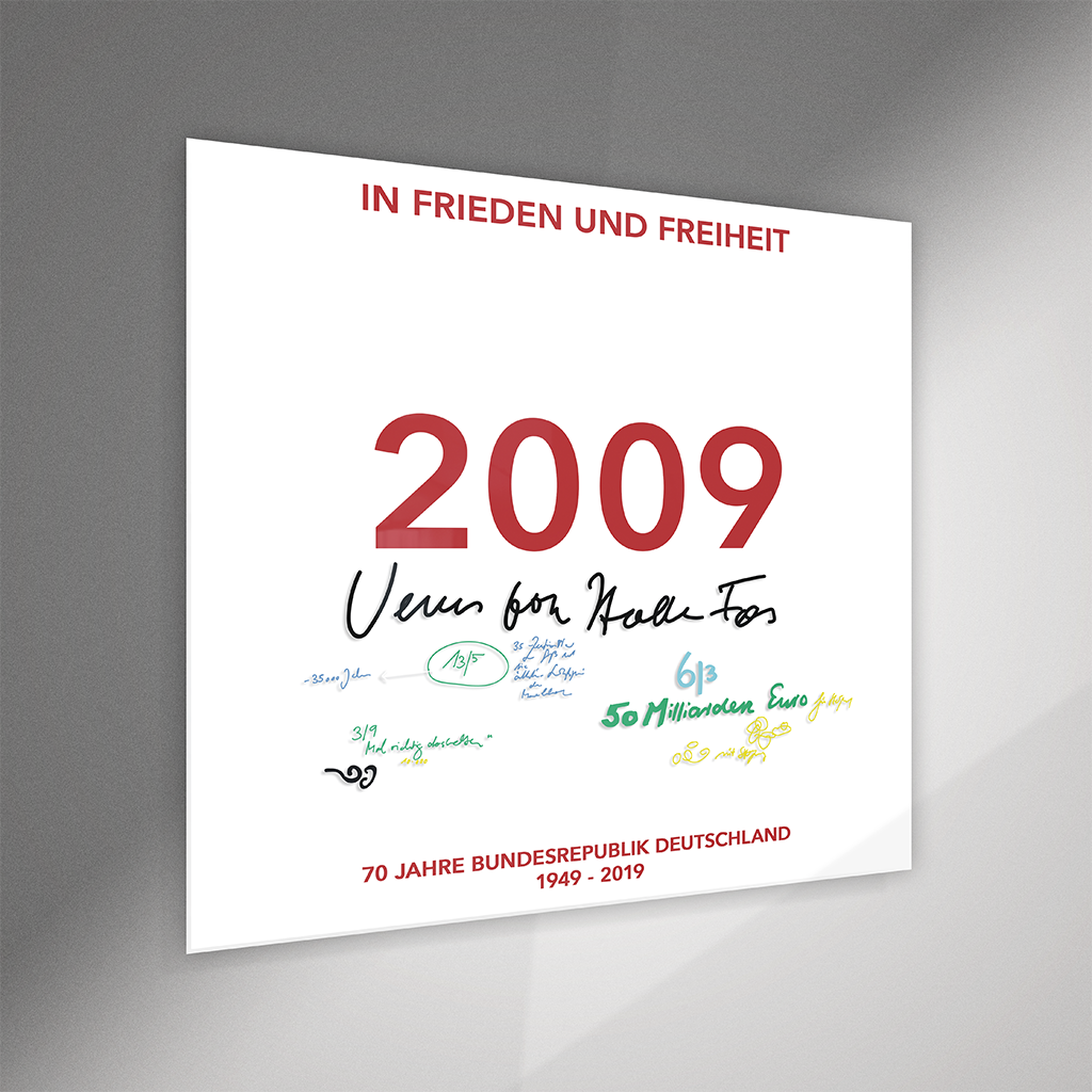 Die Hintergrund-Kaschierung trägt den jeweiligen Jahrgang, den Schriftzug "In Frieden und Freiheit" und die Jubiläumsangaben "70 Jahre Bundesrepublik Deutschland / 1949 - 2019". Auf der glänzenden Acrylplatte ist die Schrift des Künstlers mit Spezial-Lack gedruckt. Beim Jahrgang 1989 verzichtete der Künstler jedoch auf eine vorderseitige Beschriftung.