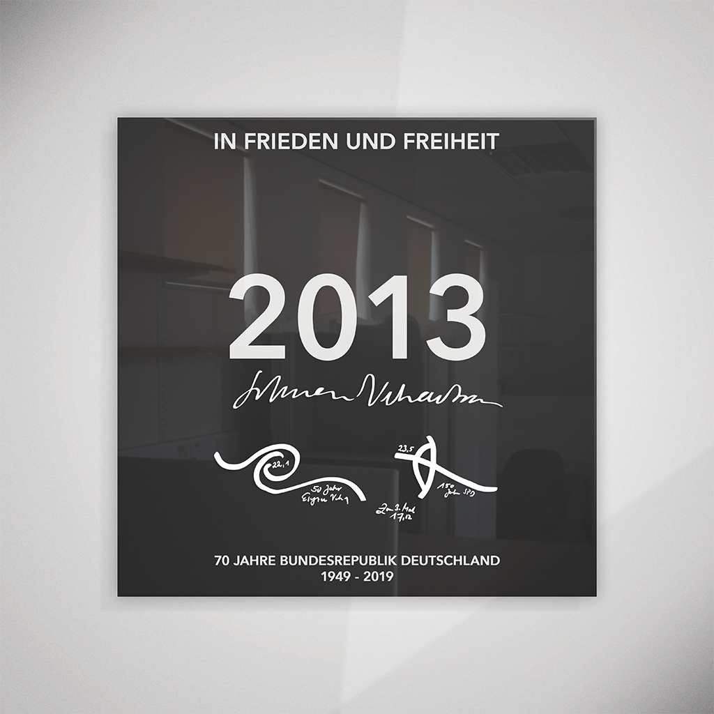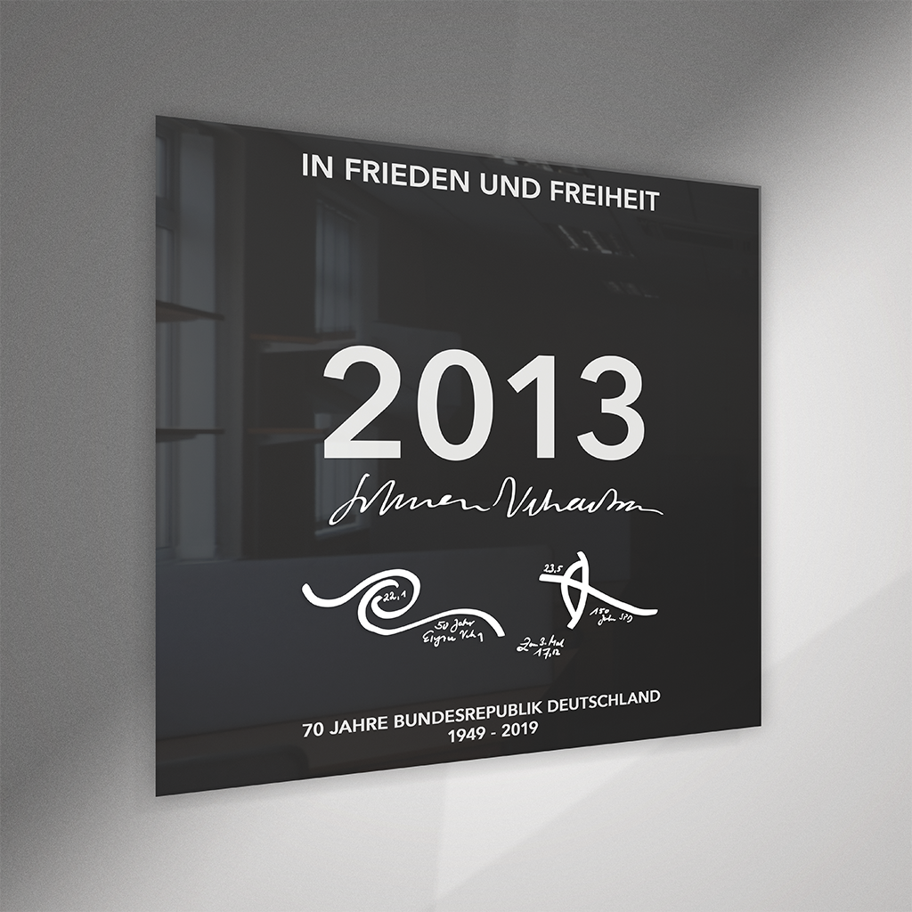 Die Hintergrund-Kaschierung trägt den jeweiligen Jahrgang, den Schriftzug "In Frieden und Freiheit" und die Jubiläumsangaben "70 Jahre Bundesrepublik Deutschland / 1949 - 2019". Auf der glänzenden Acrylplatte ist die Schrift des Künstlers mit Spezial-Lack gedruckt. Beim Jahrgang 1989 verzichtete der Künstler jedoch auf eine vorderseitige Beschriftung.
