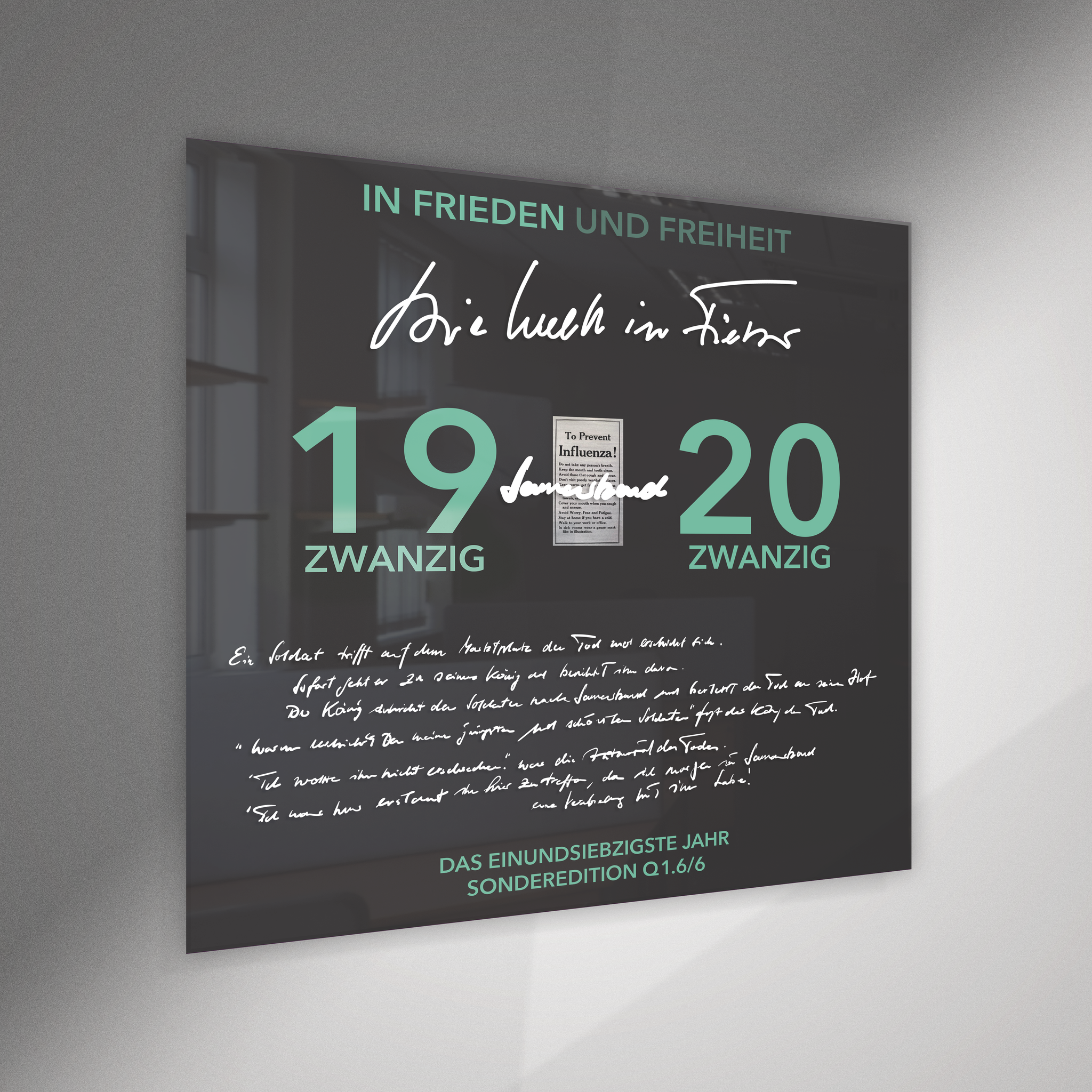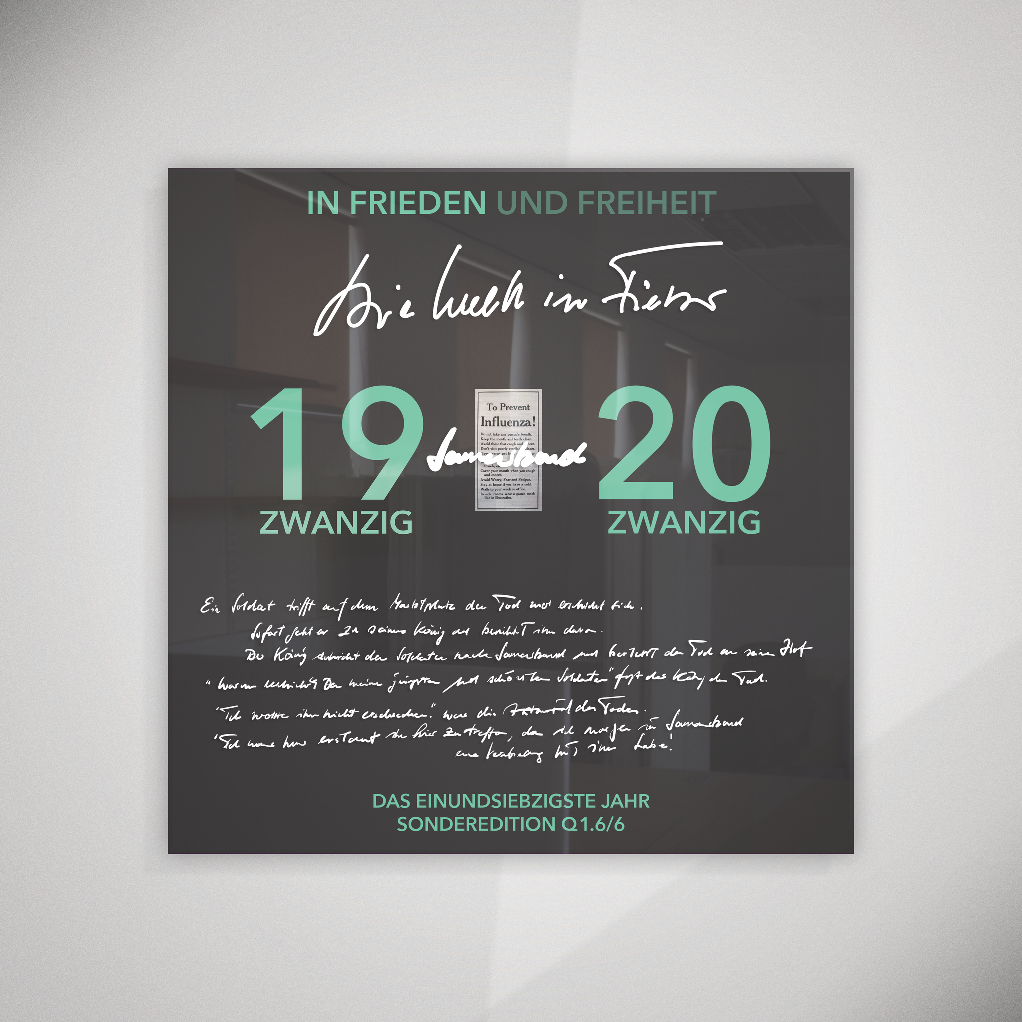 Die Hintergrund-Kaschierung trägt den jeweiligen Jahrgang, den Schriftzug "In Frieden und Freiheit" und die Jubiläumsangaben "Das Einundsiebzigste Jahr. Sonderedition Q1.6/6". Auf der glänzenden Acrylplatte ist die Schrift des Künstlers mit Spezial-Lack gedruckt.